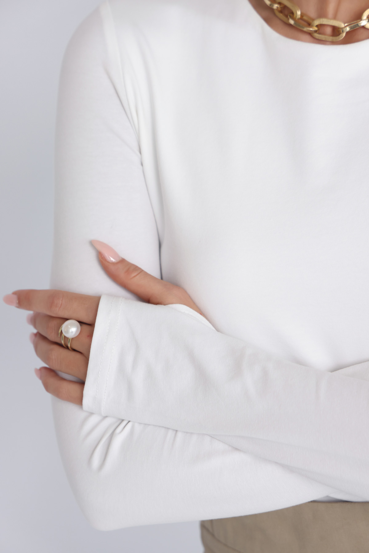 חולצת בייסיק כותנה עם שכבה כפולה ושרוול כפפה גוון לבן (57)