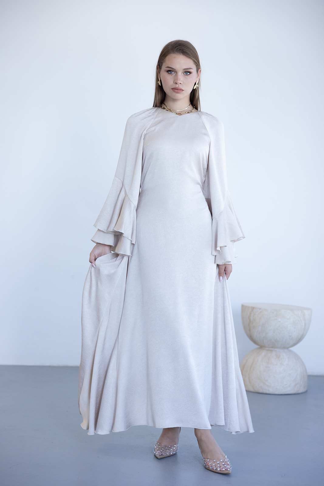 שמלת וולאן מתרחבת עם מפתח צוואר V ושרוולי מלמלה גוון שמנת (40)