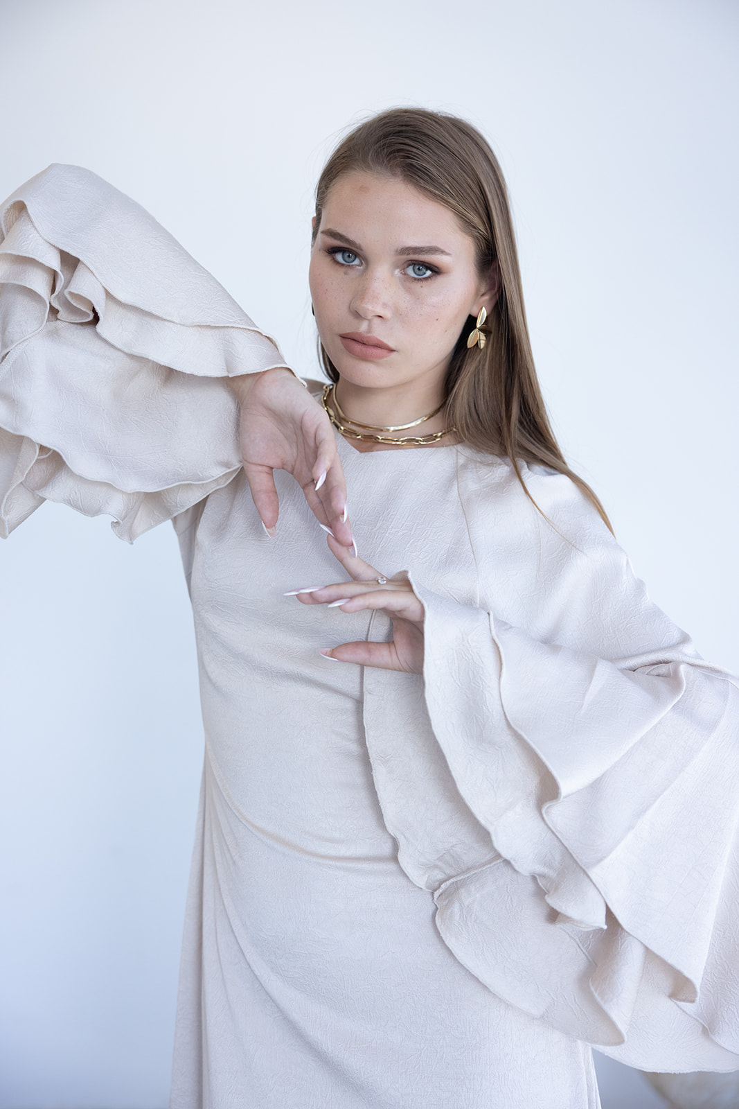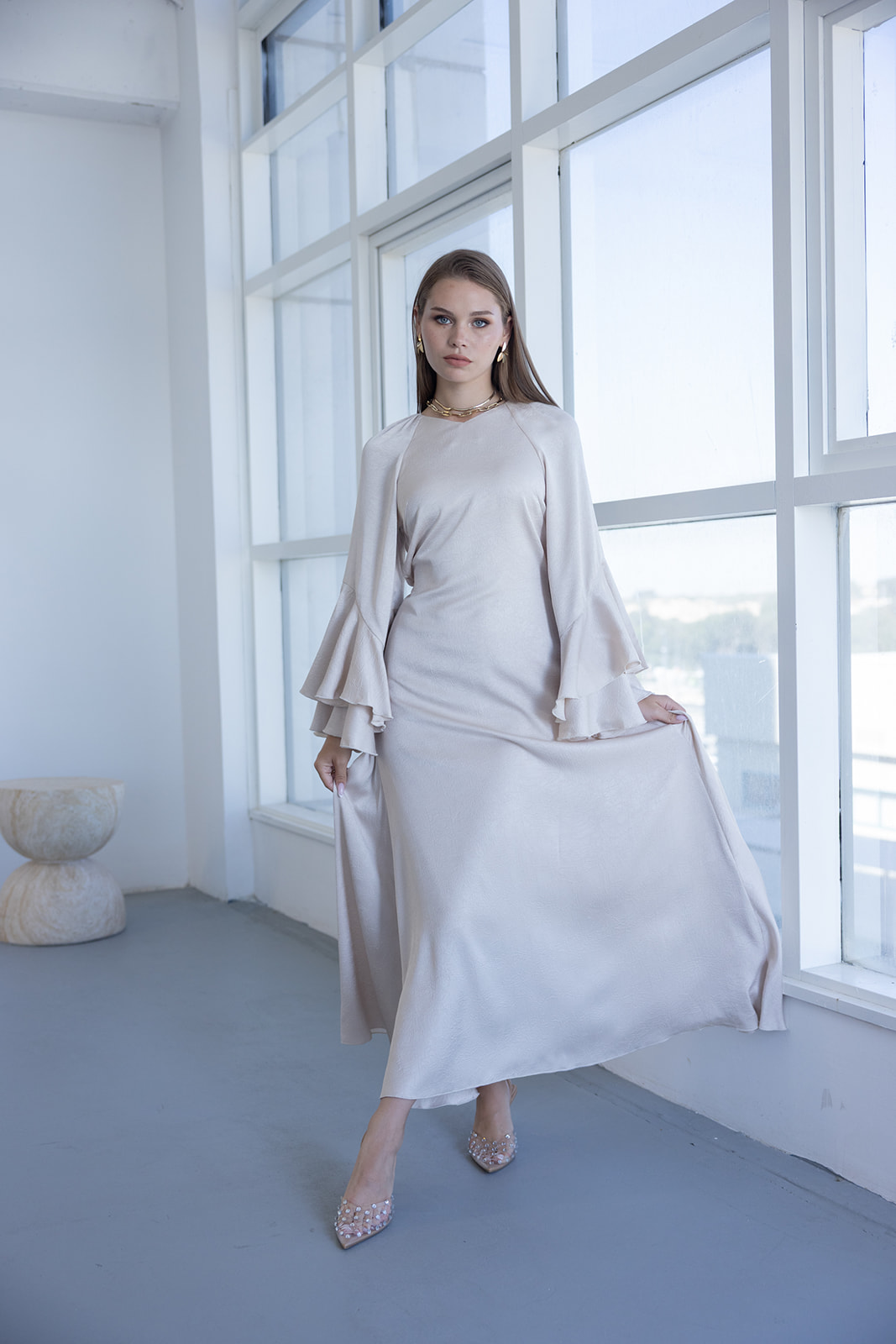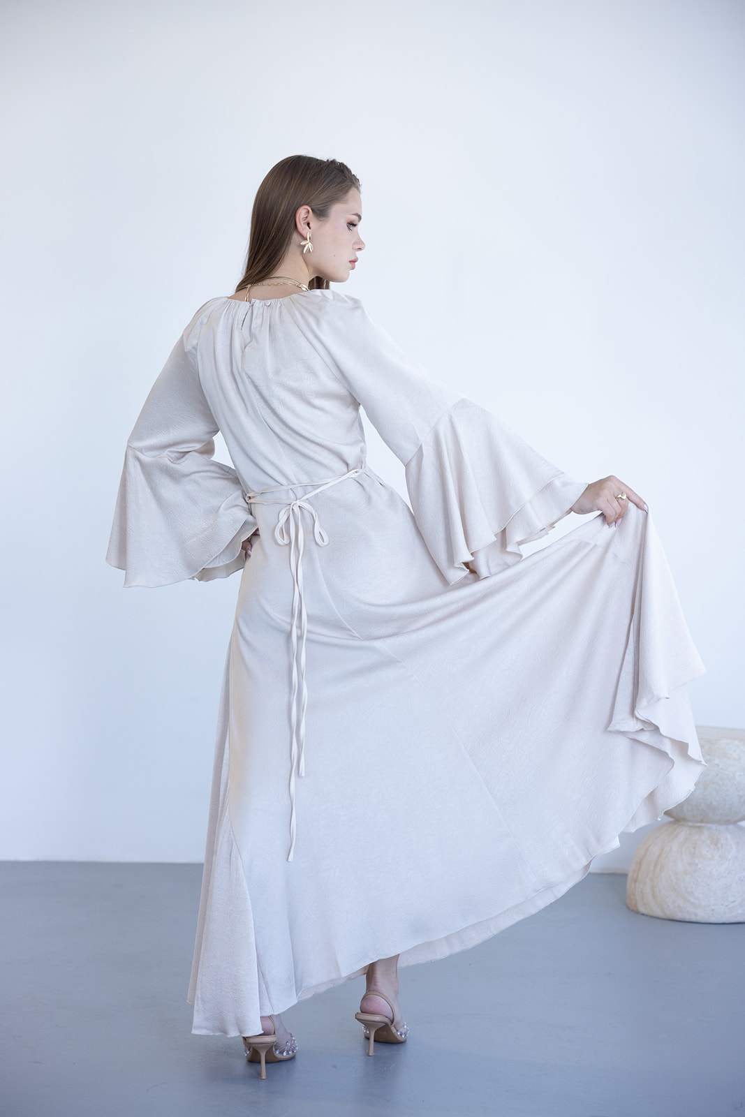שמלת וולאן מתרחבת באורך 3/4-מקסי מבד סאטן ייחודי בעיבוד טקסטורה עדינה, לשמלה מפתח צוואר V, שרוול מתרחב טרנדי בסיומת מלמלות, והרחבות בד מצידי המותן ומטה המעניקים לשמלה מראה עשיר ומחמיא. לשמלה סגירה אחורית של פתח צוואר עם 2 כפתורים לאופציית הקטנה / הגדלה של פתח הצוואר.