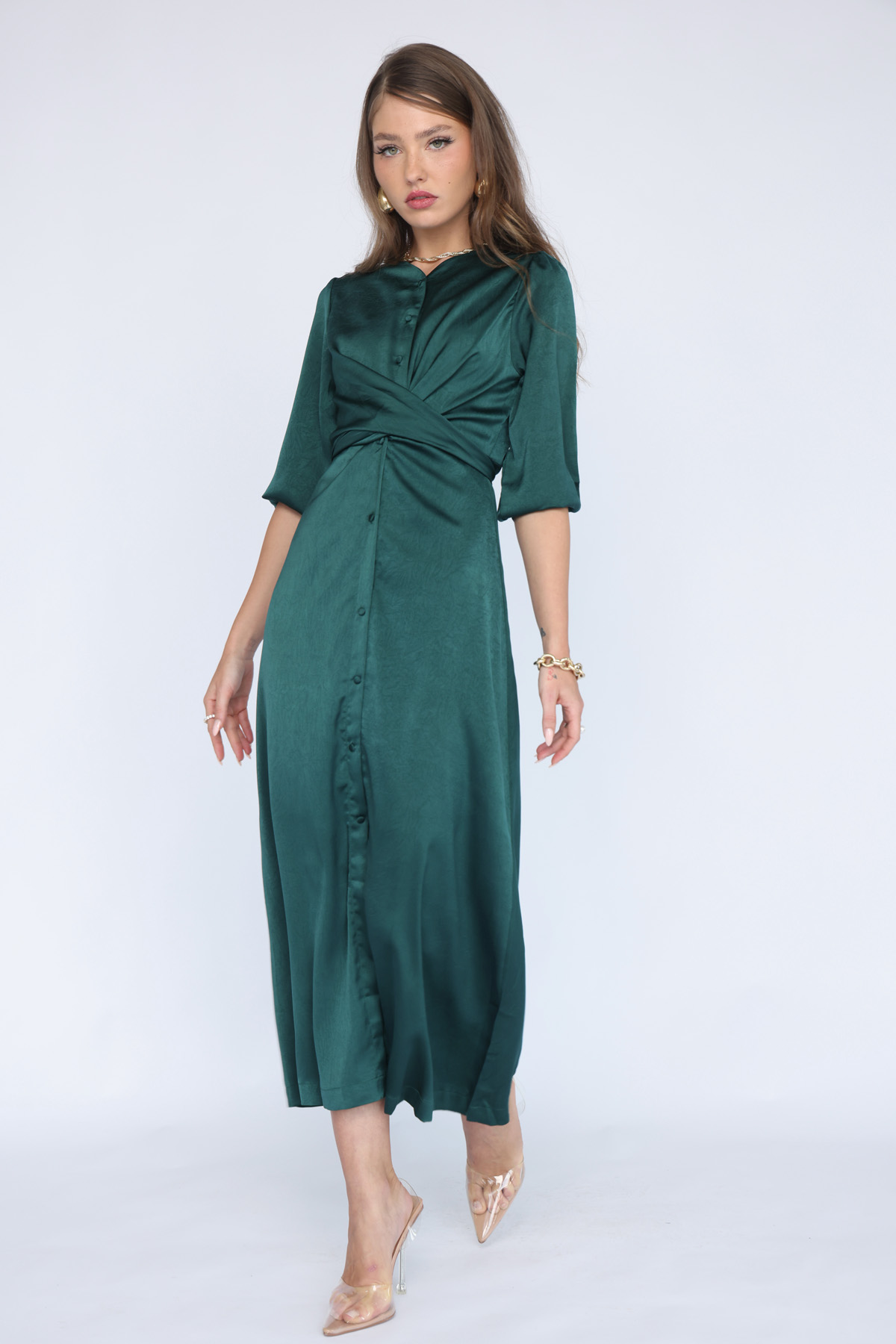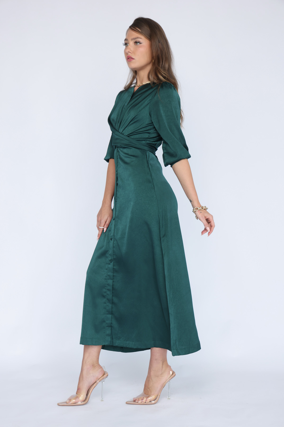 שמלת טוויסט מכופתרת עם 2 אופציות קשירה אורך 3/4 גוון ירוק כהה (11)