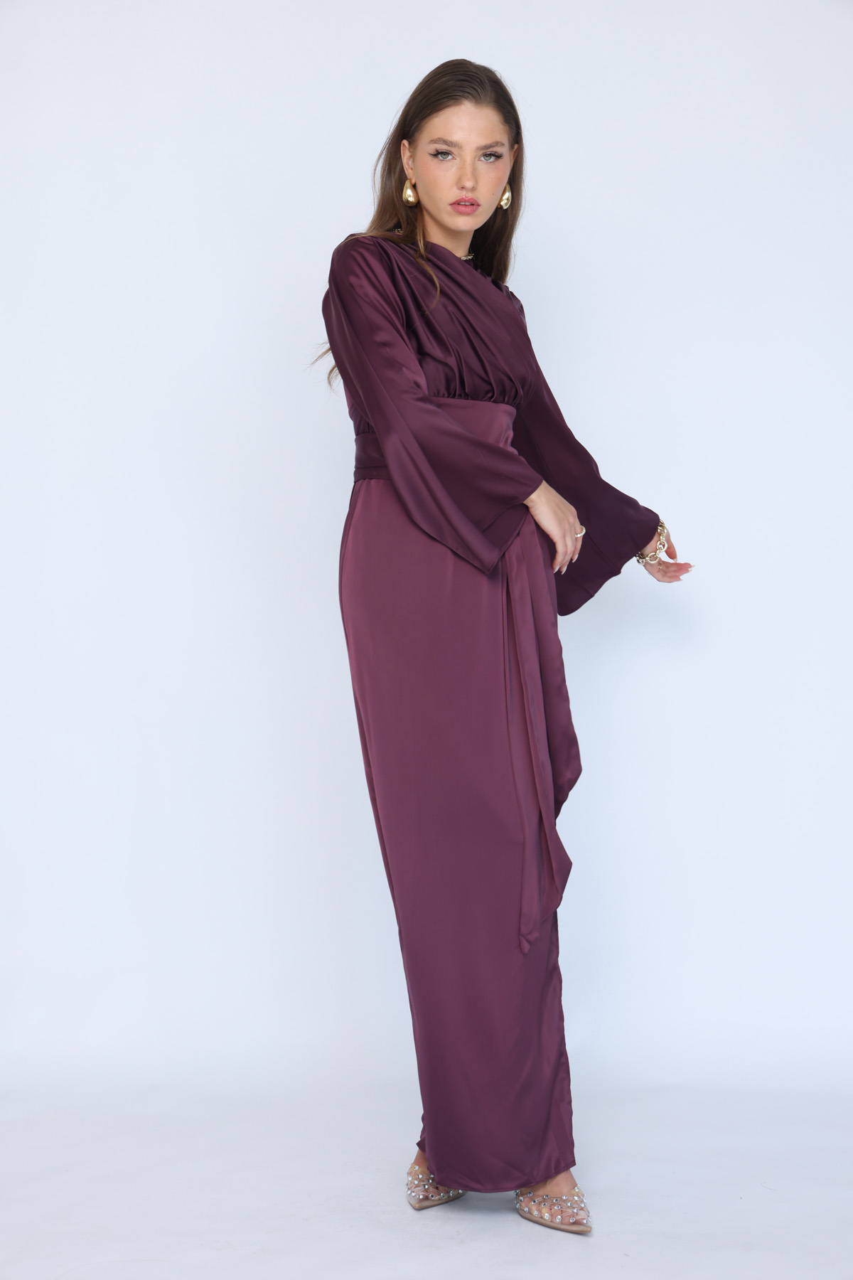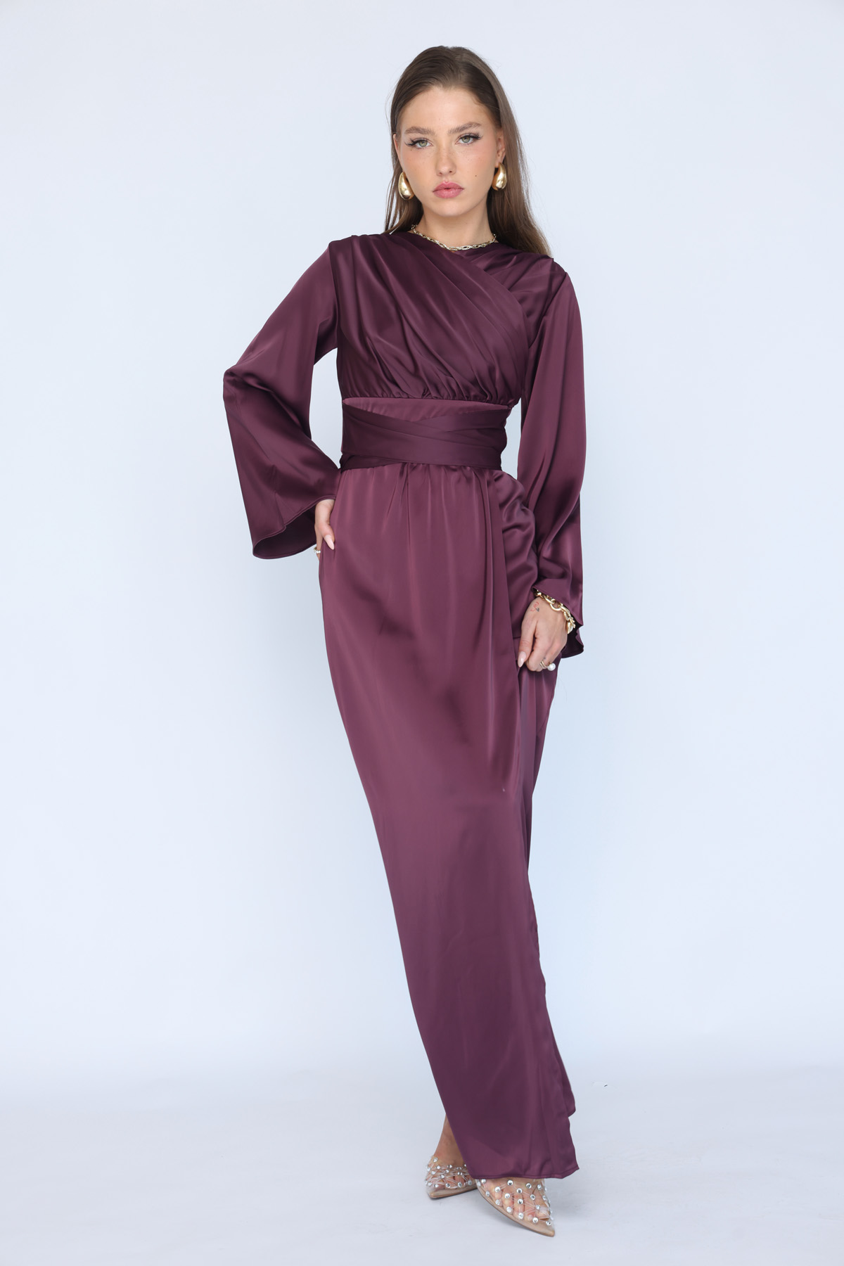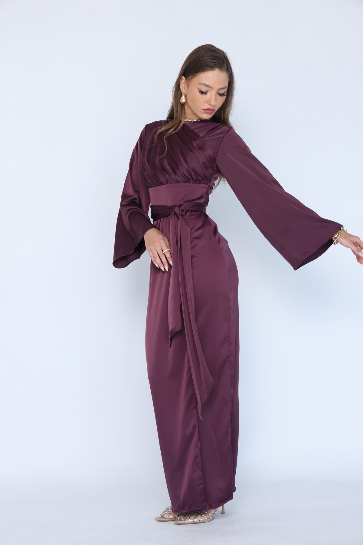 שמלת מעטפת קימונו באורך מקסי וקשירה מחטבת גוון סגול כהה (36)