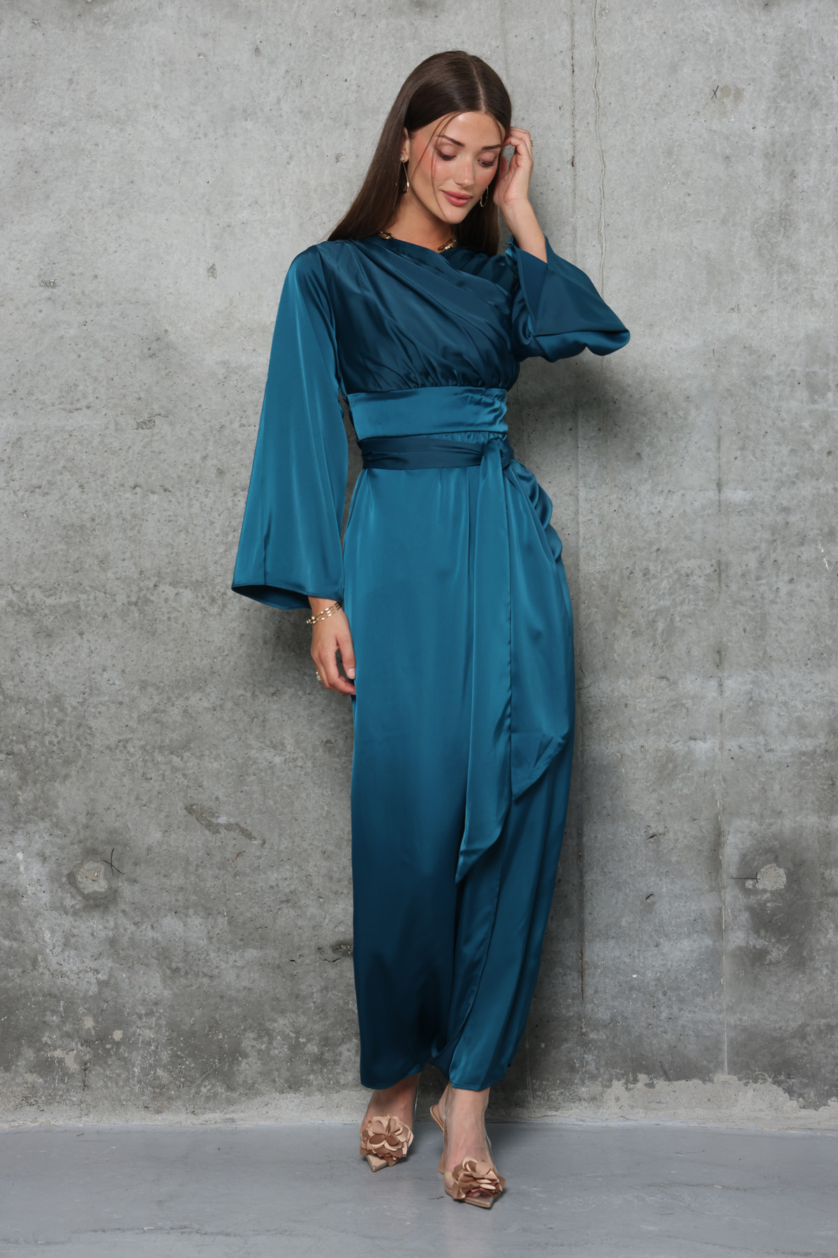 שמלת מעטפת מקסי מבד סאטן איכותי בגיזרה טרנדית הכוללת עיטופי בד ושרוולי קימונו מתרחבים, גיזרה מחמיאה לגוף במיוחד באמצעות קשירה מחטבת במותן עם אופציית קשירה קדמית או קשירת X אחורית להתאמה מיטבית למבנה הגוף.