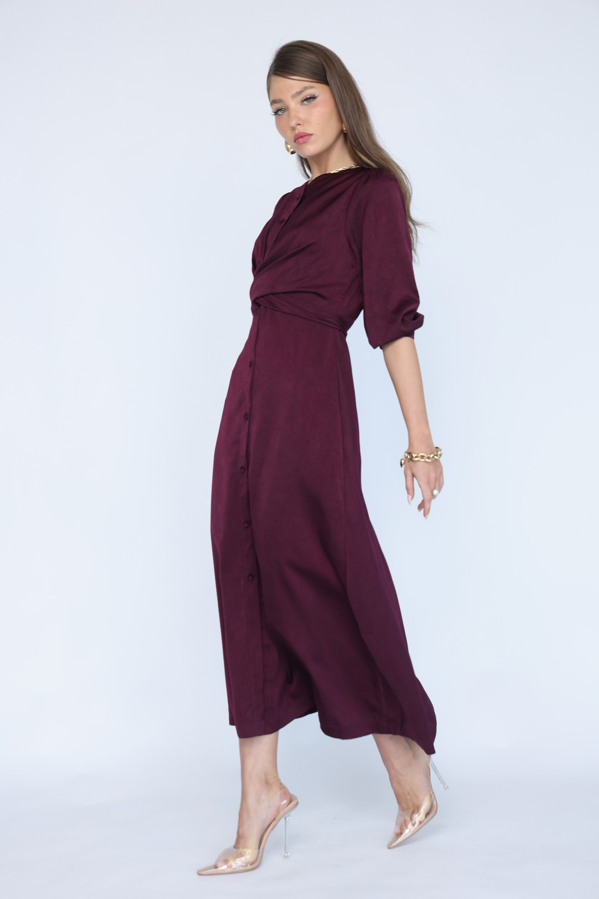 שמלת אוברסייז באורך מקסי מבד סאטן ייחודי בעיבוד טקסטורת קמט עדינה, השמלה מגיעה עם חגורה דקה תואמת לבד השמלה לאופציית קשירה אחורית להדגשת המותן ולהתאמה מיטבית למבנה הגוף, לשמלה מפתח צוואר עשיר בכיווצים עם קשירות פפיונים, שרוולים מתרחבים עם סיומת מלמלות, והרחבות בד צדדיות שמעניקות לשמלה מראה עשיר בבד ומחמיא לגוף במיוחד.