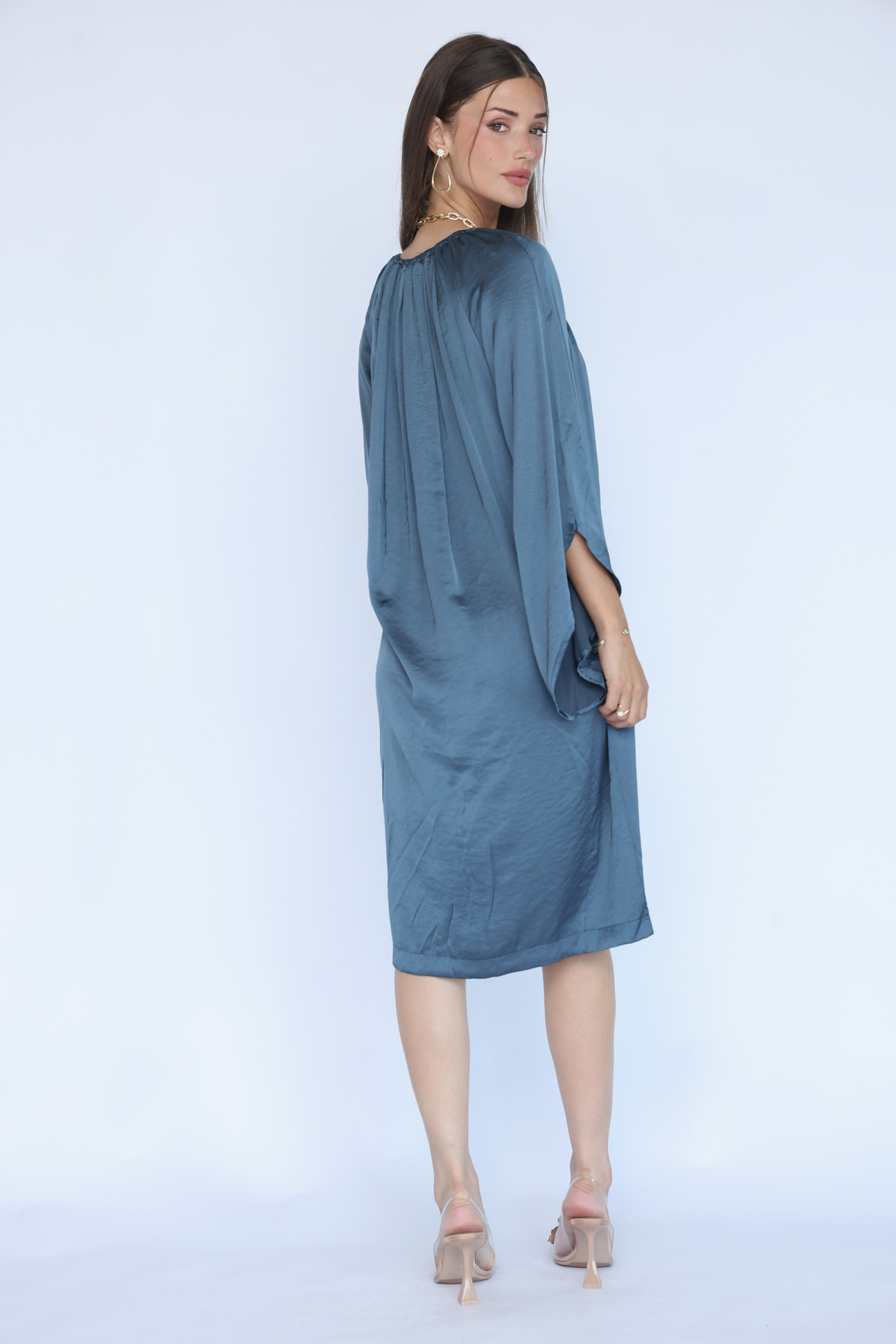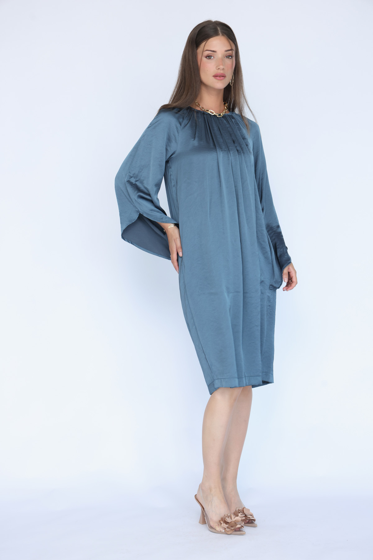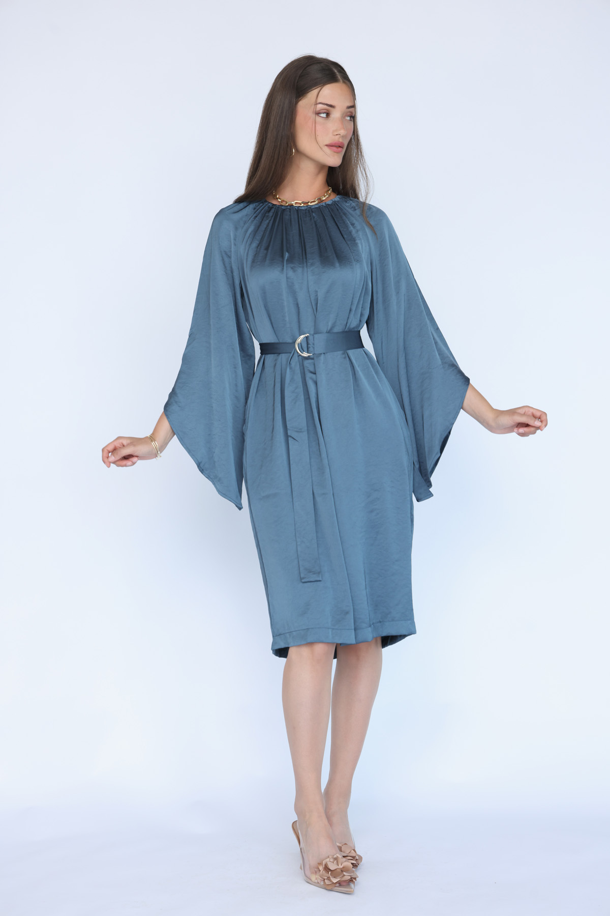 שמלת סאטן וויסקוזה בגיזרת אוברסייז עשירה עם מפתח צוואר גמיש עם כיווצים, כיסים בצידי השמלה, שרוול מתרחב טרנדי וחגורת אבזם תואמת לבד השמלה לאופציית לבישה נוספת להתאמה מיטבית למבנה הגוף.