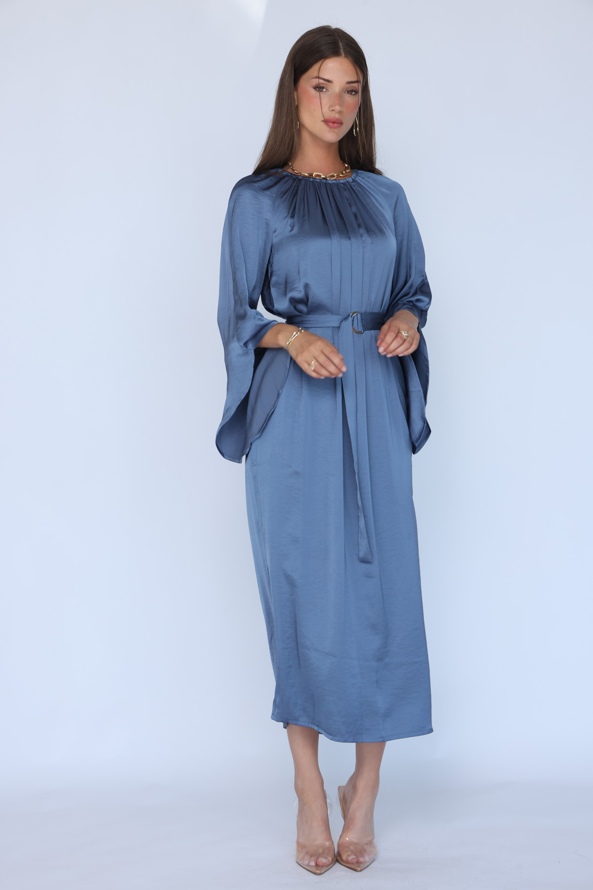 שמלת סאטן וויסקוזה באורך 3/4 עם חגורת אבזם גוון כחול (50)