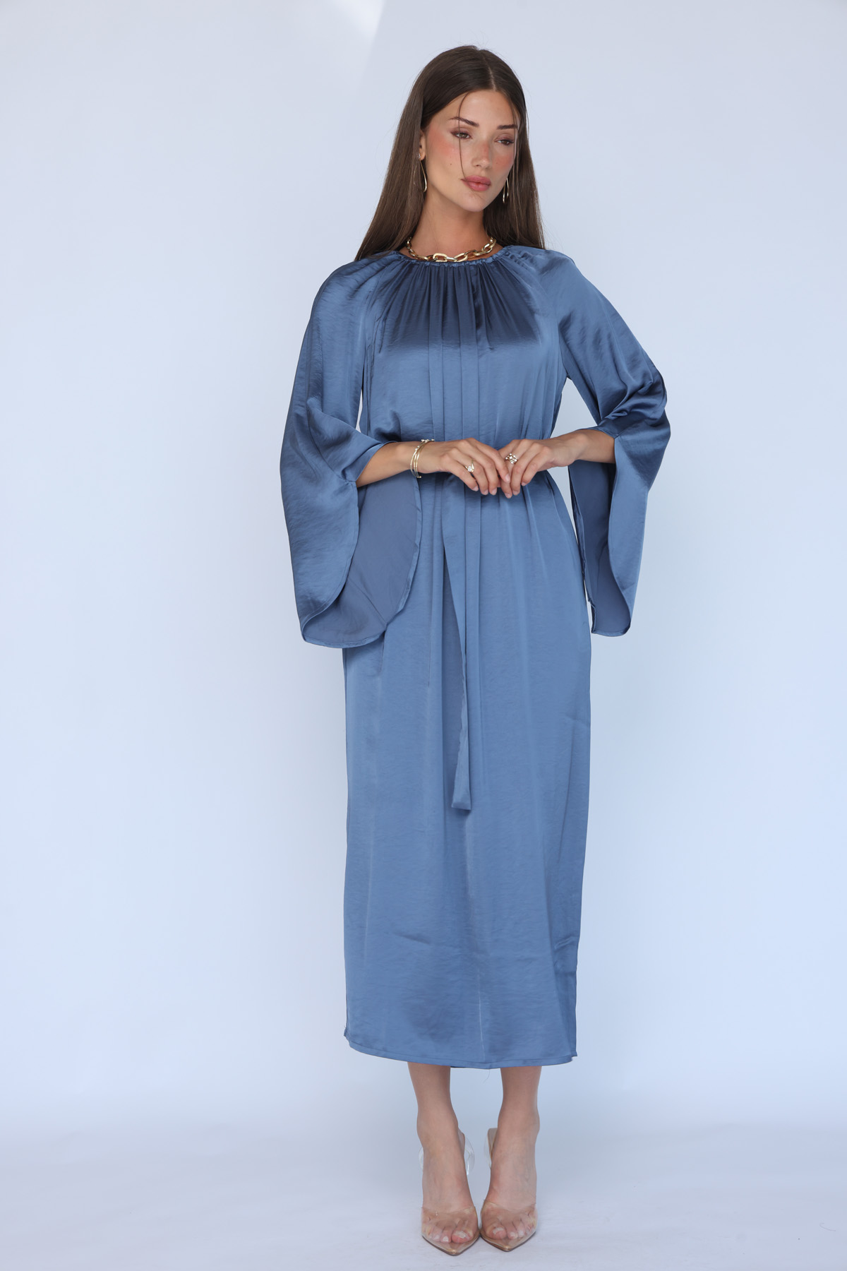 שמלת סאטן וויסקוזה בגיזרת אוברסייז עשירה עם מפתח צוואר גמיש עם כיווצים, כיסים בצידי השמלה, שרוול מתרחב טרנדי וחגורת אבזם תואמת לבד השמלה לאופציית לבישה נוספת להתאמה מיטבית למבנה הגוף.