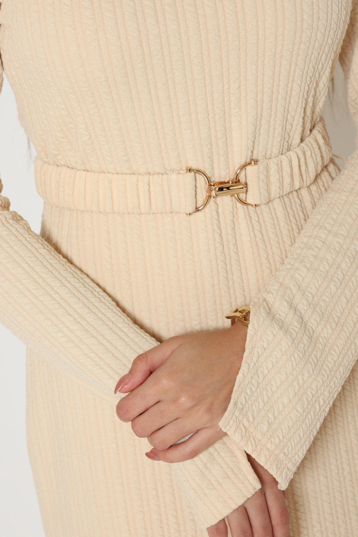 השמלה יוצרה מבד סריג איכותי בטקסטורה עדינה של צמות, גיזרה ישרה ארוכה עם פתחי צד, ושרוולים טרנדיים עם סיומת פתוחה. השמלה מגיעה עם חגורת אבזם תואמת כאופציית לבישה נוספת להדגשת המותן.