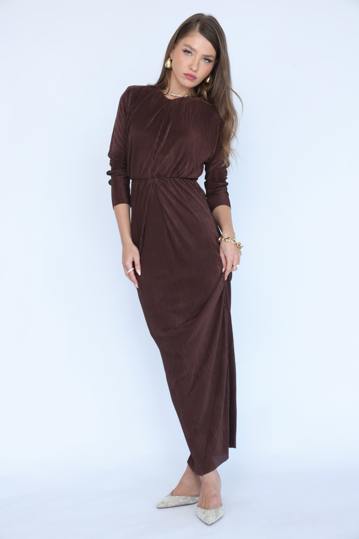 שמלת פליסה מקסי עם חיתוך מותני גוון בראון (17)