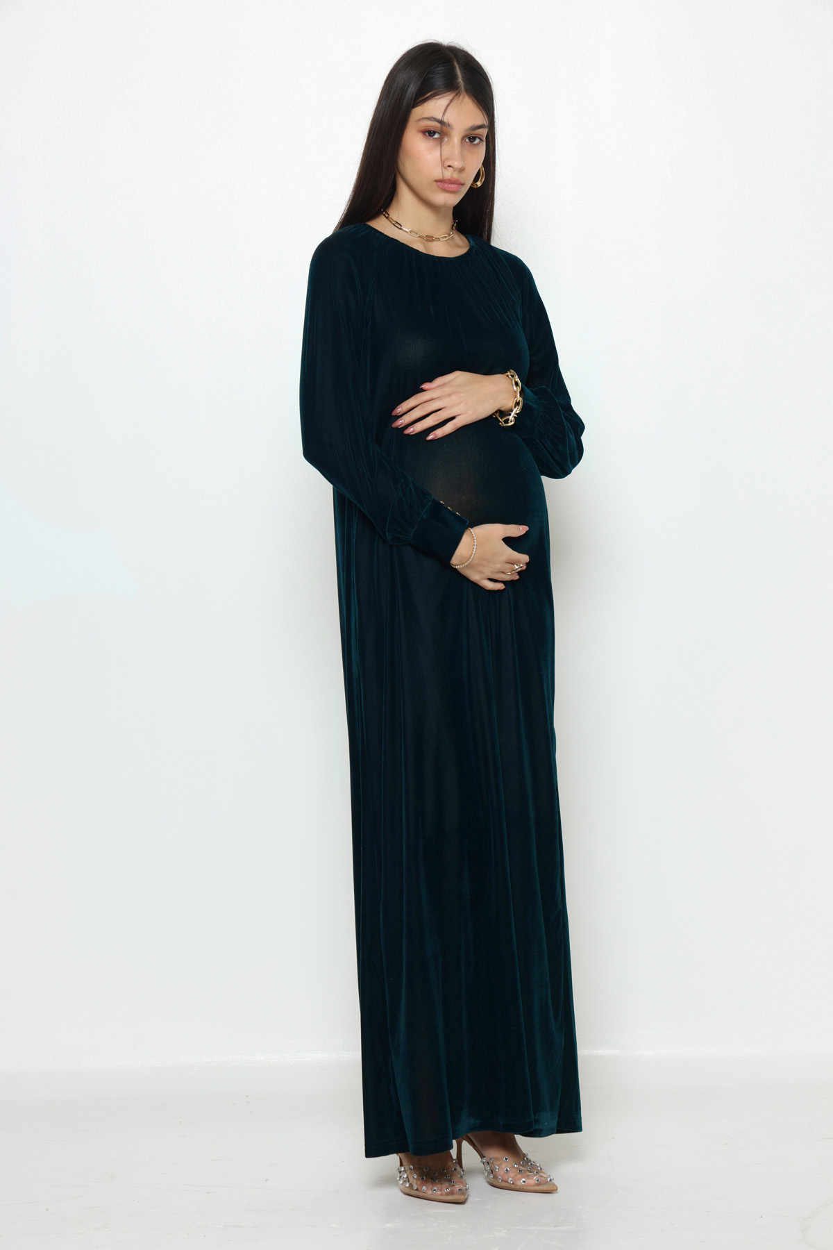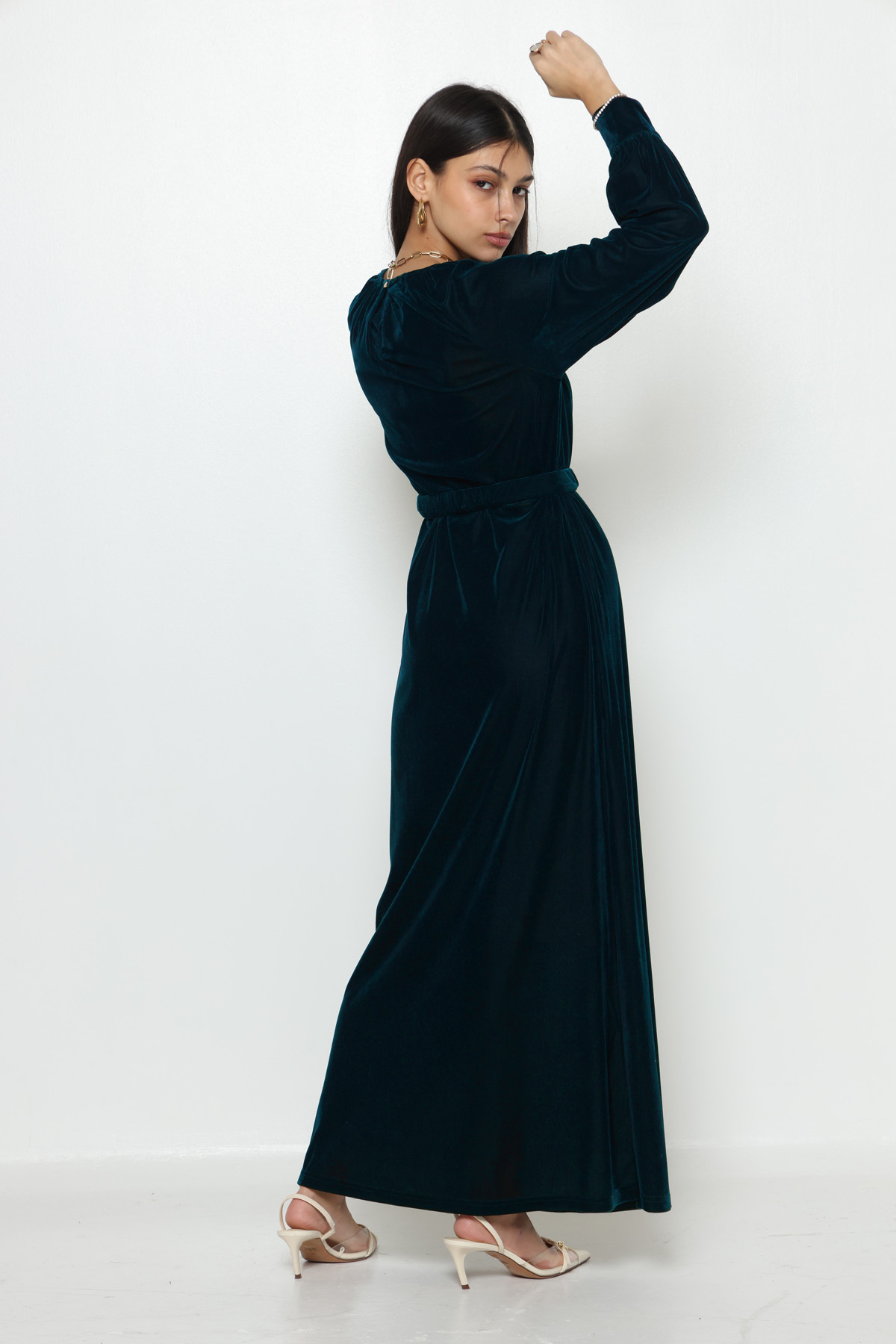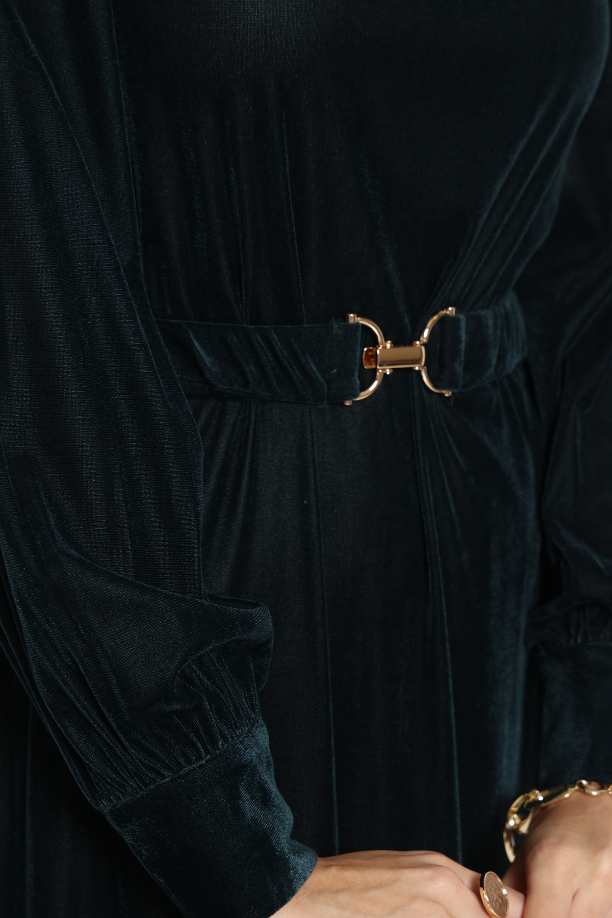 שמלת קטיפה דקה בגיזרת אוברסייז מקסי וחגורת אבזם גוון טורקיז-שחור (76)