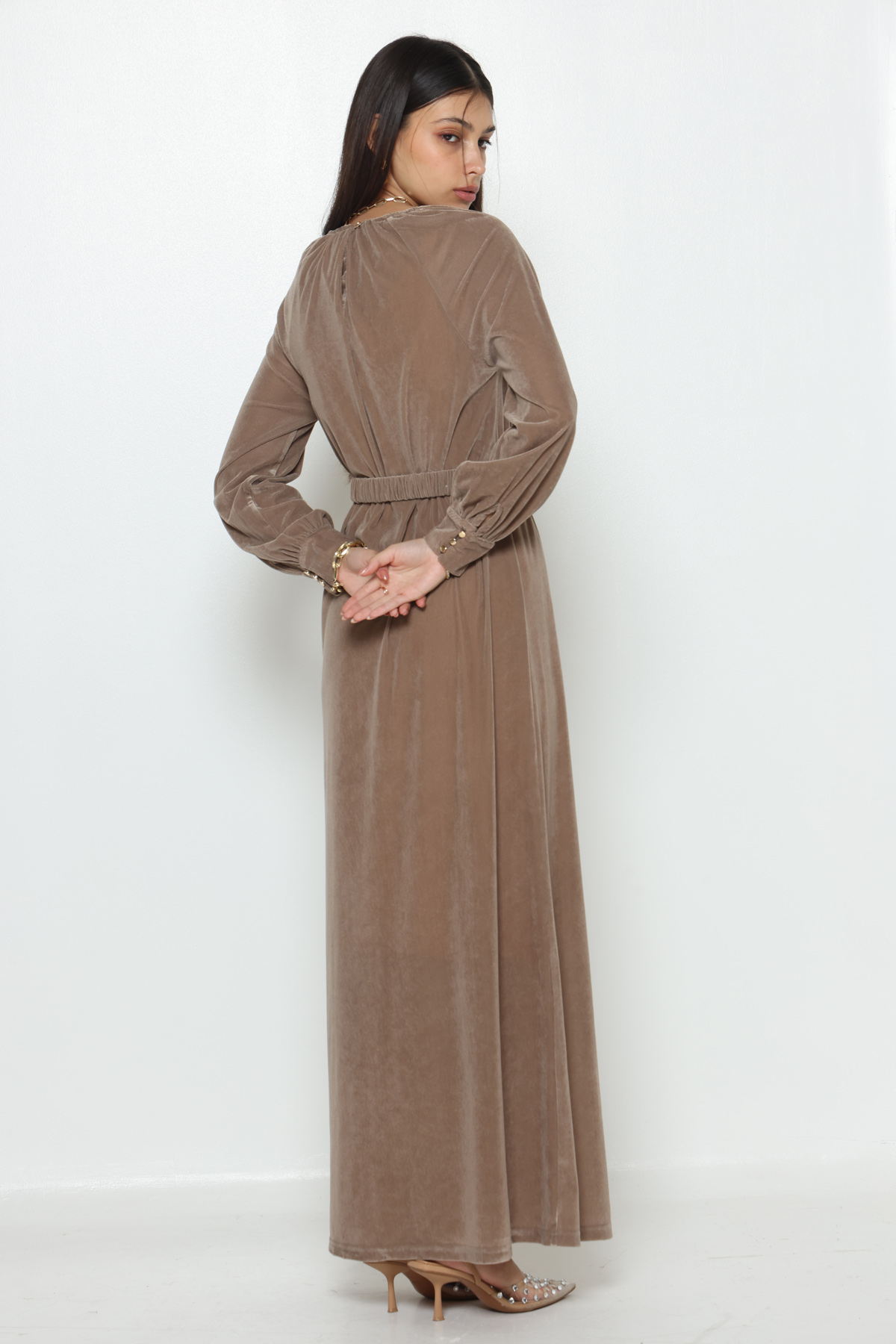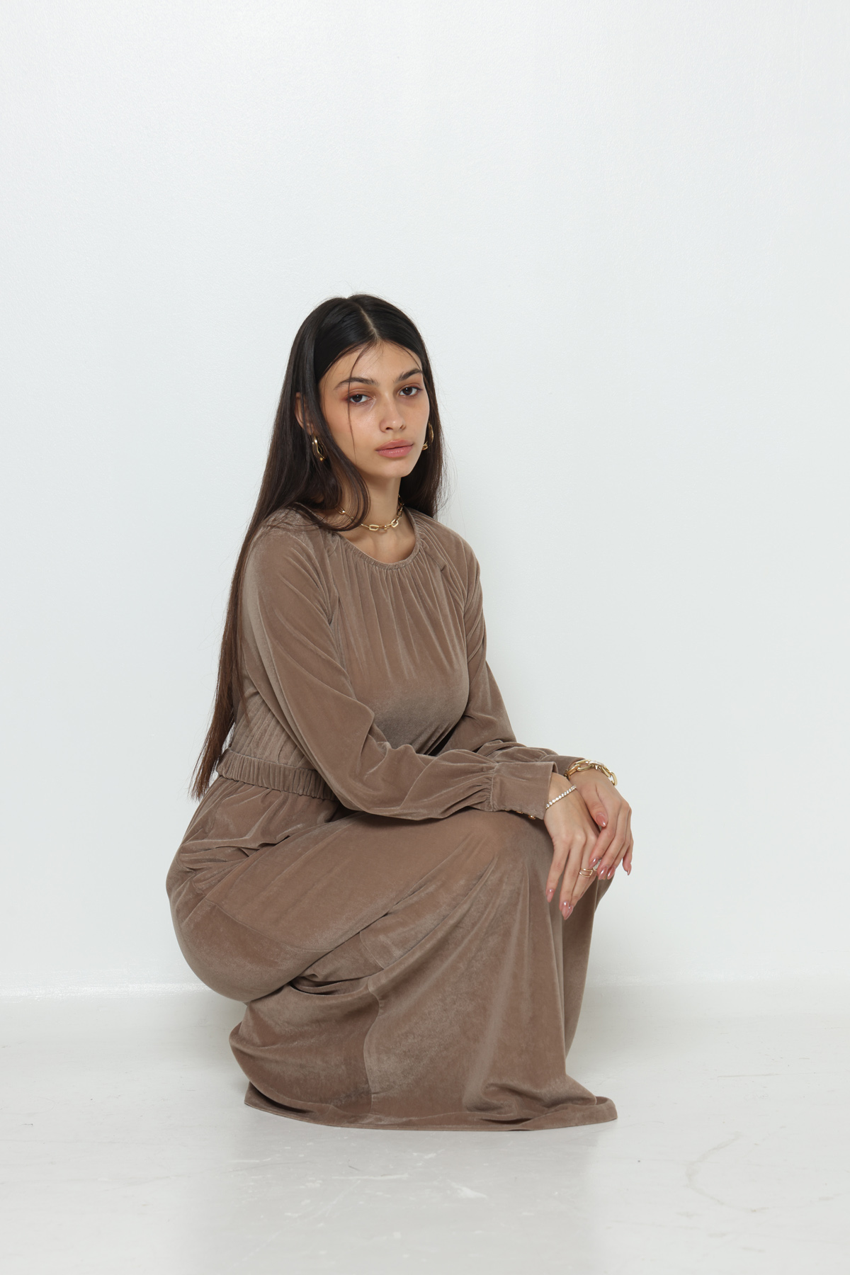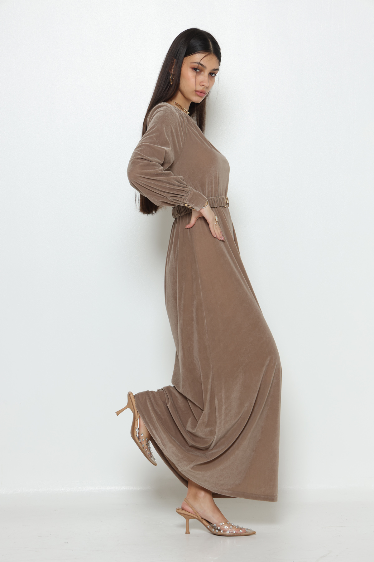 שמלת קטיפה דקה בגיזרת אוברסייז מקסי וחגורת אבזם גוון קפה (76)