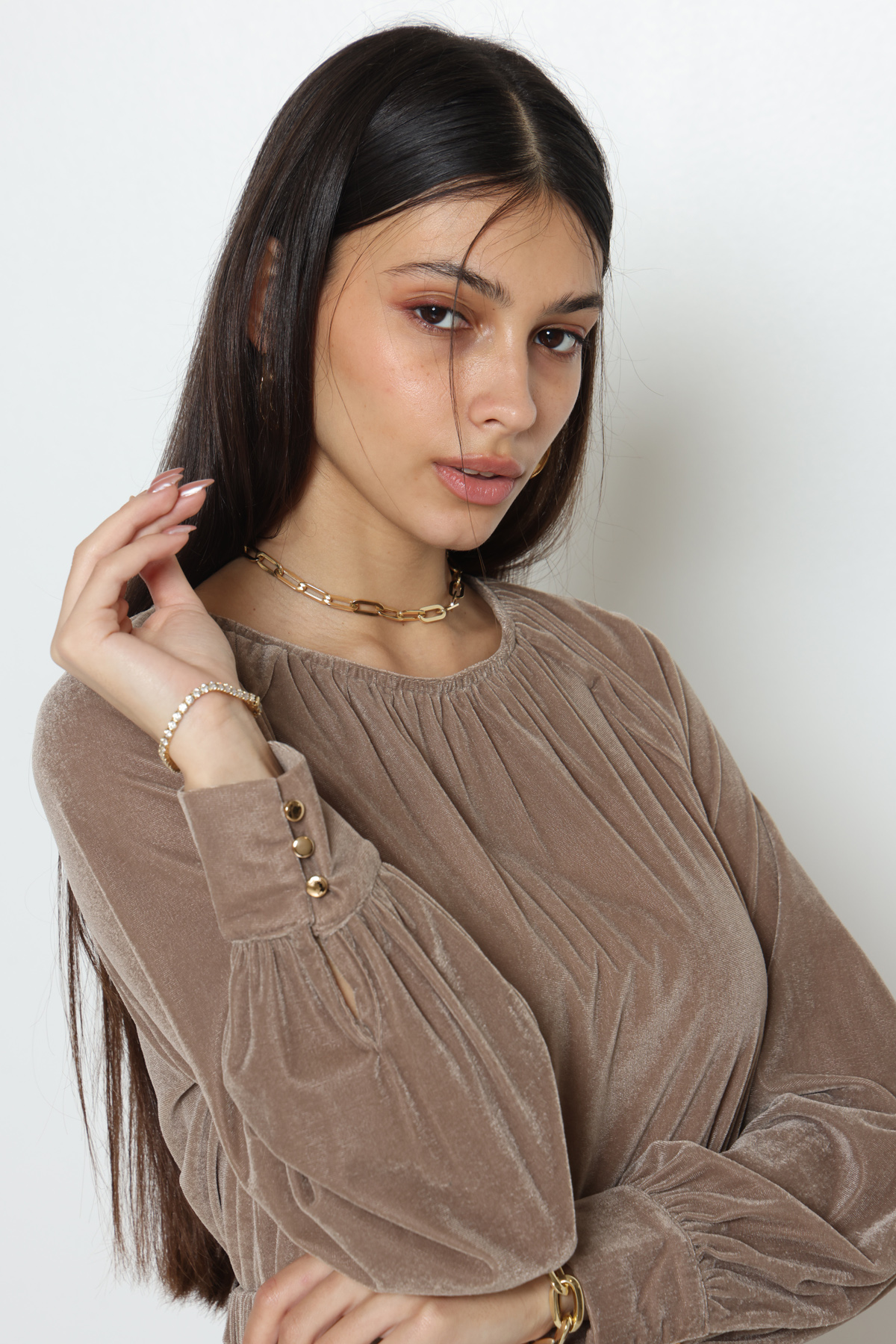 שמלת הקטיפה שלנו עוצבה במיוחד לחורף הישראלי מבד קטיפה דק וקליל במיוחד! (שימושי גם לעונת המעבר), בגיזרת אוברסייז קלילה ומלאה בסטייל עם כיווצים טרנדיים במפתח הצוואר, סיומת שרוול עם ידון בסגירת כפתורי זהב וחגורת אבזם תואמת לבד השמלה לאופציית לבישה נוספת – ולהתאמה מיטבית  למבנה הגוף.