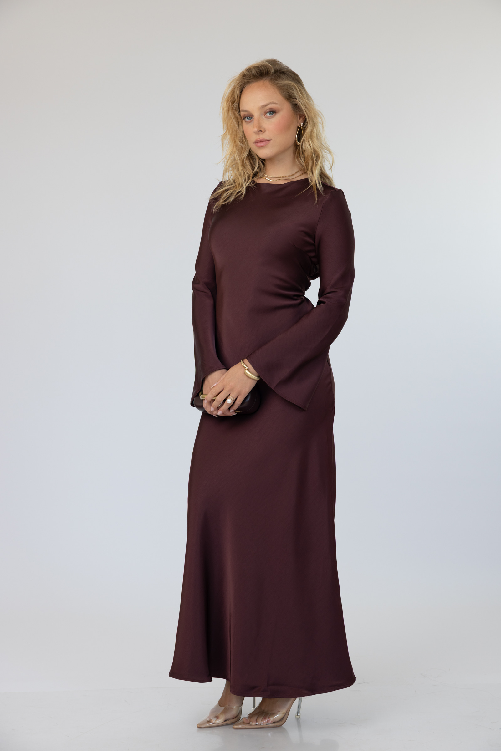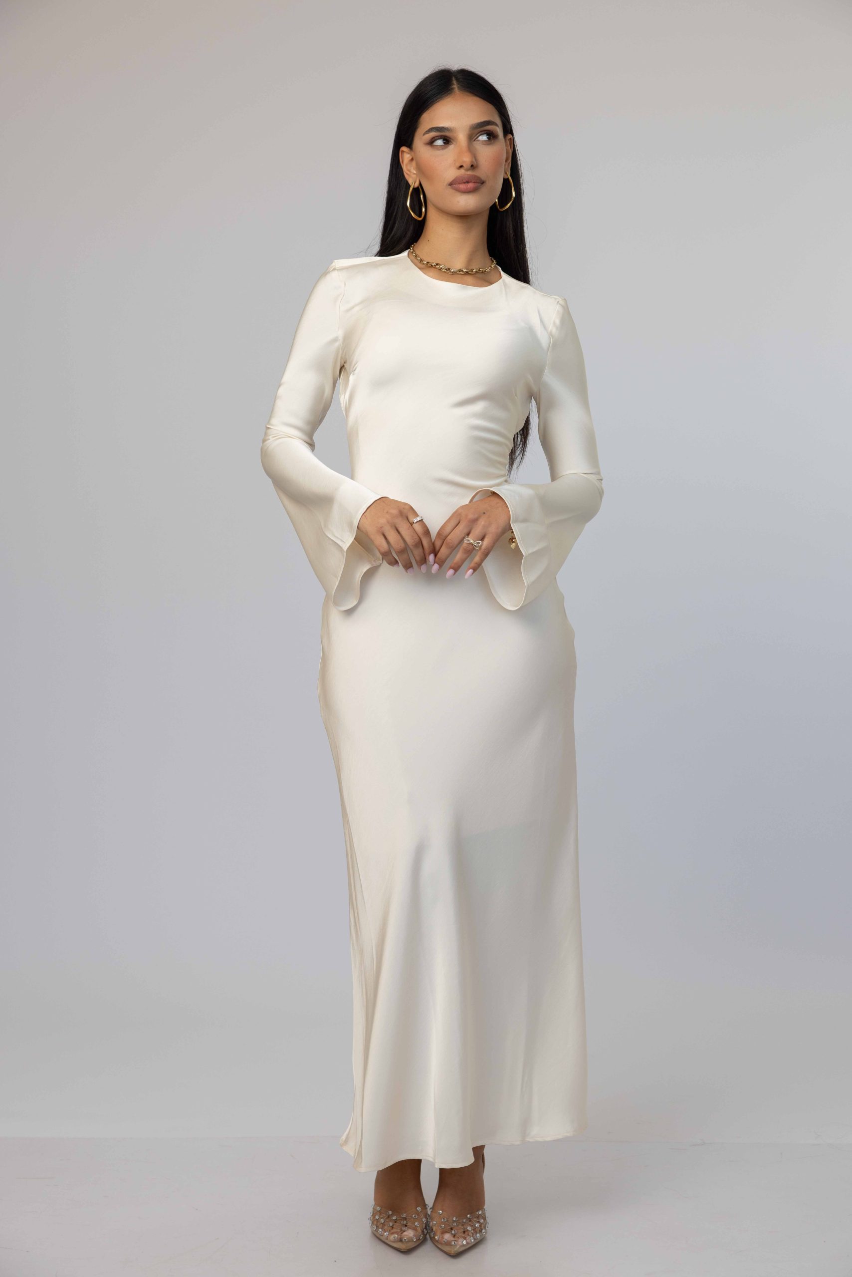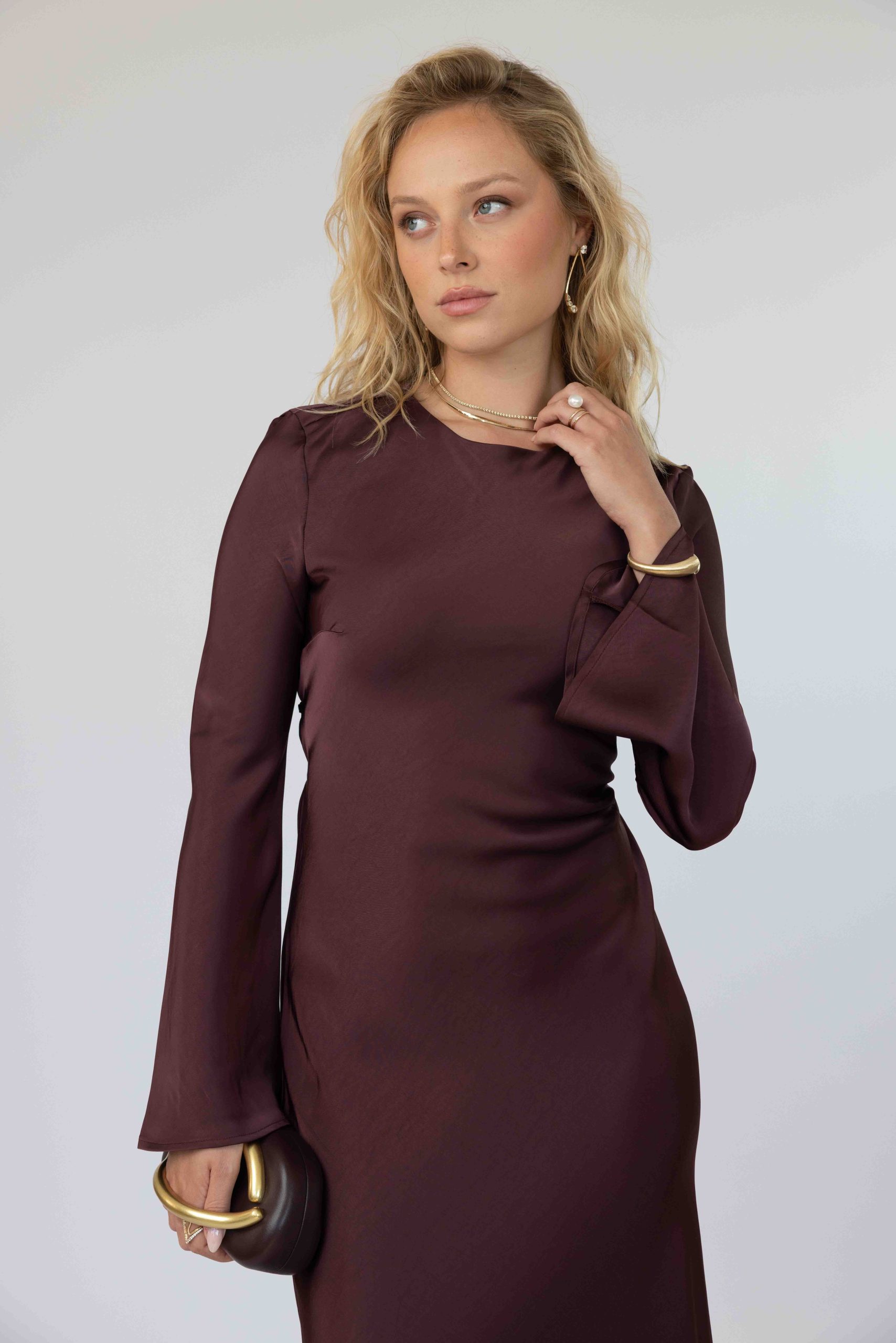 השמלה מגיעה באורך מקסי, מפתח צוואר עגול, סגירת רוכסן אחורית ושרוול טרנדי ארוך ומתרחב.