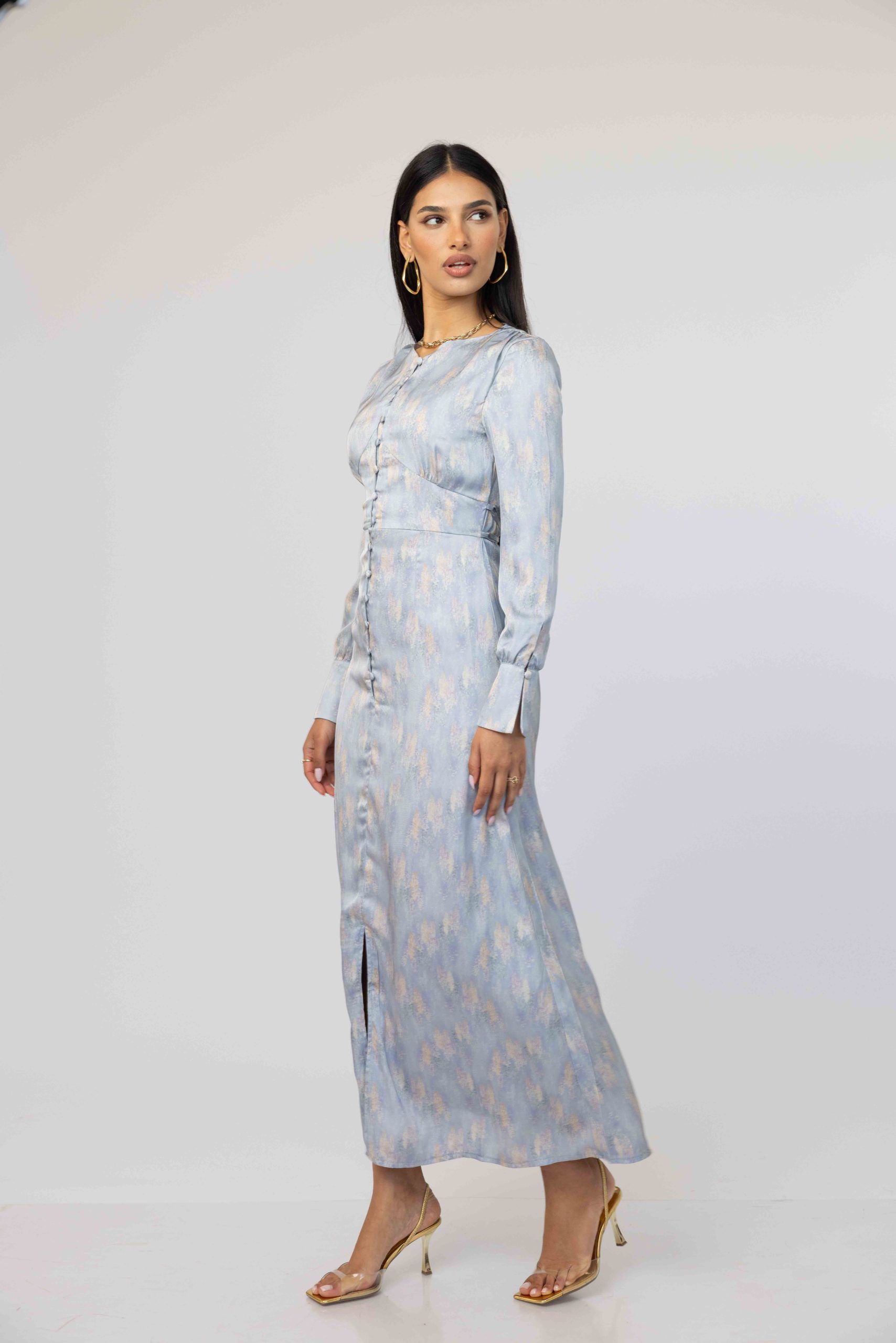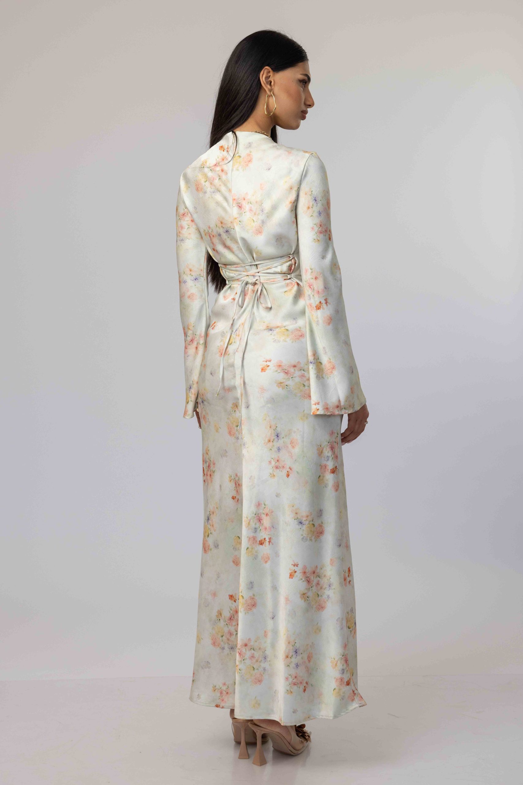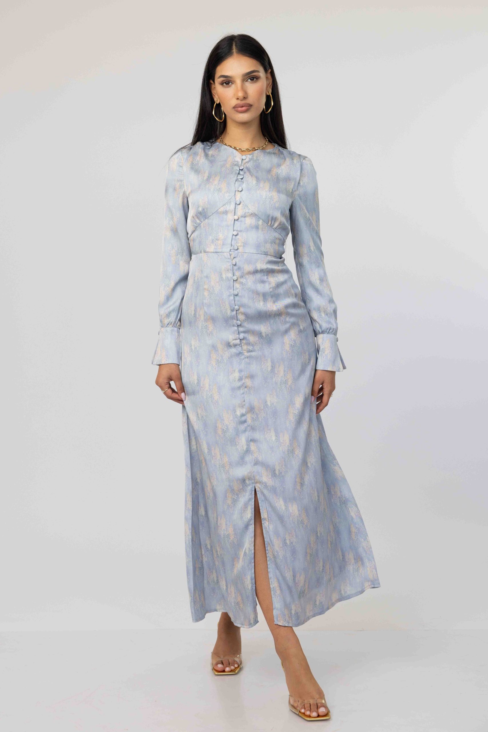 השמלה מגיעה באורך מקסי, מפתח צוואר עגול, סגירת רוכסן אחורית ושרוול טרנדי ארוך ומתרחב.